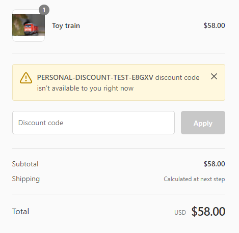 <figure><img src="https://3731721370-files.gitbook.io/~/files/v0/b/gitbook-x-prod.appspot.com/o/spaces%2F-LZdVZovthV0SPlgxS6Y%2Fuploads%2FZC4VBRP2pqQEkalsSjPS%2Fpersonal-discount-code-shopify-expired-checkout.png?alt=media&#x26;token=63caa8d3-8d8b-46fa-a630-c45f09323c35" alt=""><figcaption></figcaption></figure>