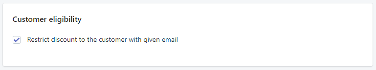 <figure><img src="https://3731721370-files.gitbook.io/~/files/v0/b/gitbook-x-prod.appspot.com/o/spaces%2F-LZdVZovthV0SPlgxS6Y%2Fuploads%2FUKWMVwZUwLYy2GKaK09v%2Fpersonal-discount-code-shopify-restrict-to-the-customer-with-given-email-address.png?alt=media&#x26;token=91938837-98ef-4113-a91e-0898747ec7b0" alt=""><figcaption></figcaption></figure>