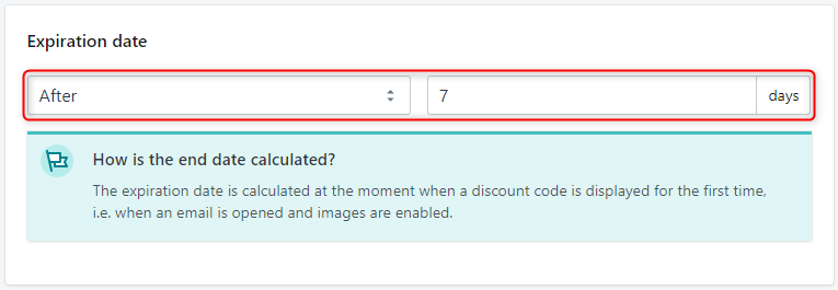 <figure><img src="https://3731721370-files.gitbook.io/~/files/v0/b/gitbook-x-prod.appspot.com/o/spaces%2F-LZdVZovthV0SPlgxS6Y%2Fuploads%2FNKlYYqlt9lnwPmBOr2lO%2Fpersonal-discount-code-shopify-expiraration-date.png?alt=media&#x26;token=53a9d771-8d6d-41ef-a0a6-97785d42b32b" alt=""><figcaption></figcaption></figure>